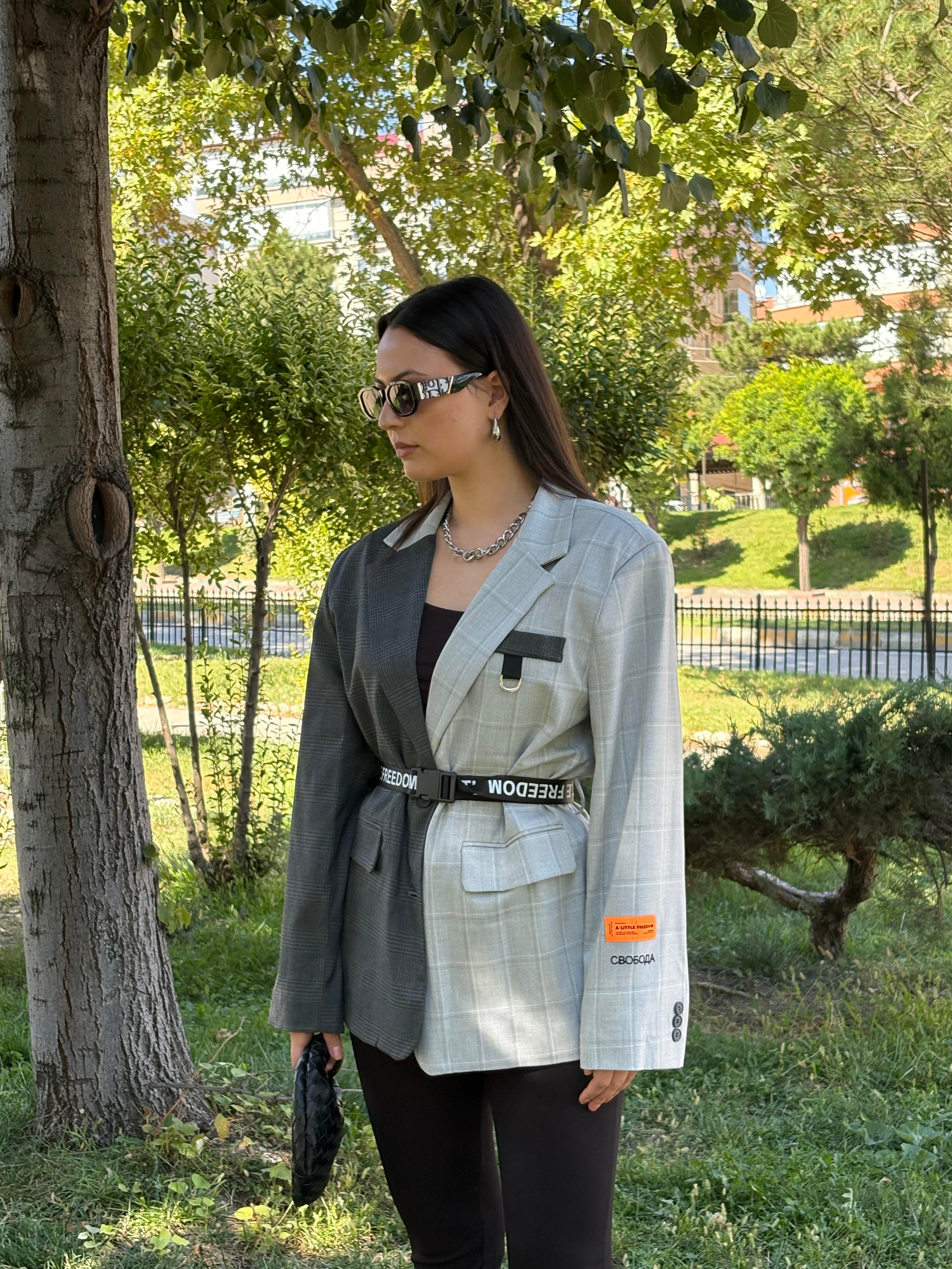 GRİ ÇİFT RENK KEMERLİ BLAZER CEKET