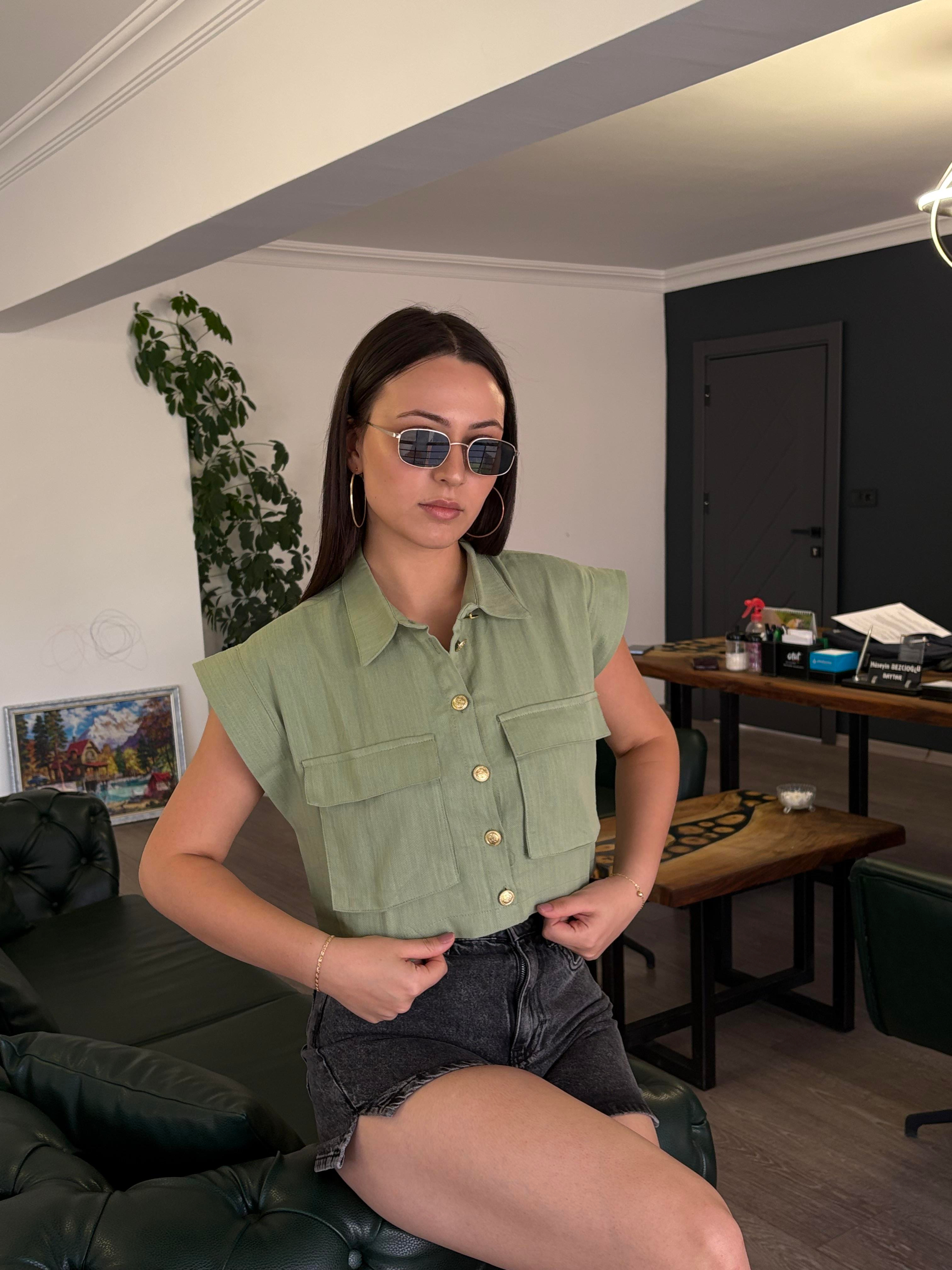 YEŞİL 2 CEPLİ CROP GÖMLEK